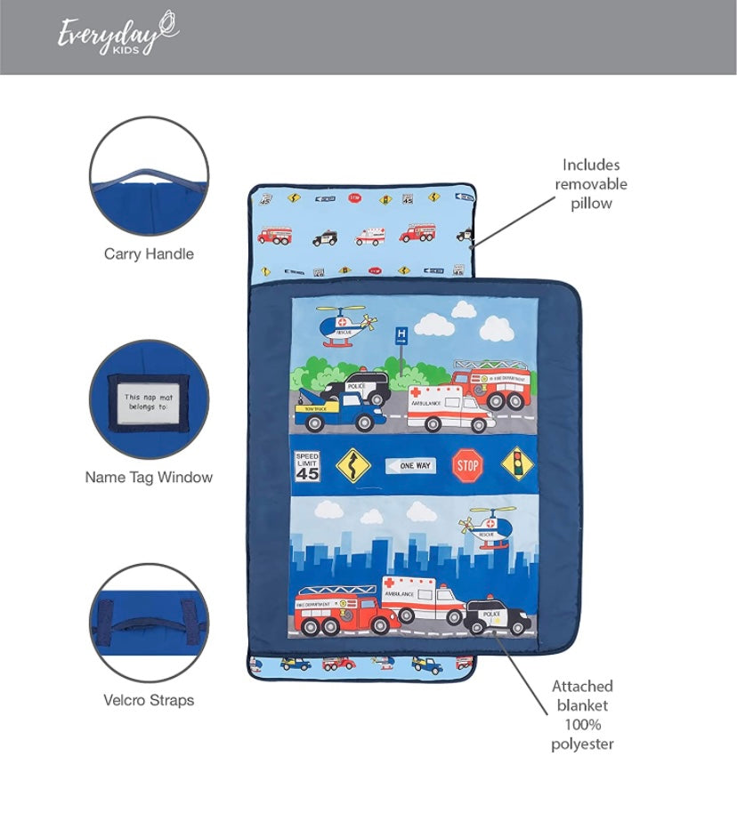 Quilted mat, ultra soft blanket and pillow all in one. Rolls up with velcro closure tabs and easy carry handle
