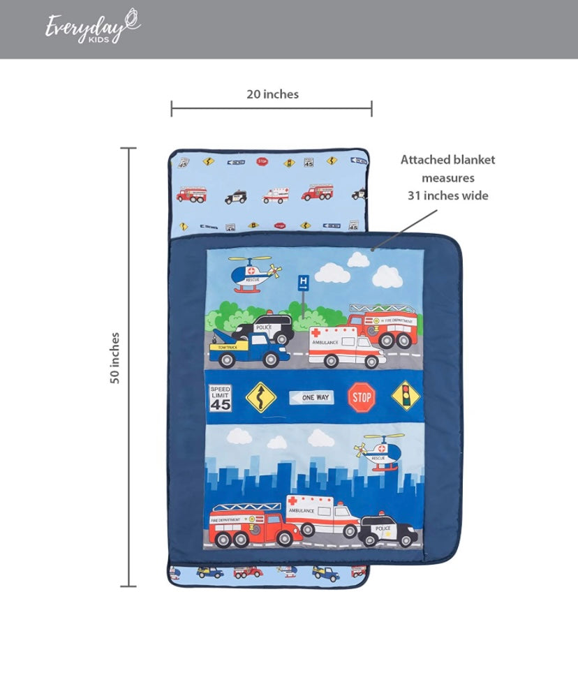 The mat measures 20” in width by 50” in length with the attached blanket measuring 31” in width by 40” length